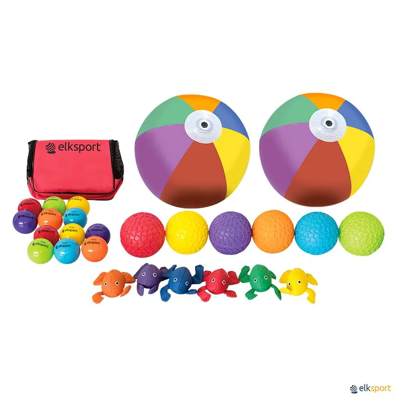 Conjunto de acessórios muito colorido para dinamizar as atividades com paraquedas: 6 rãs, 6 bolas táteis, 12 bolas All-Ball, 2 Bolas de praia e bolsa para transportar e armazenar.