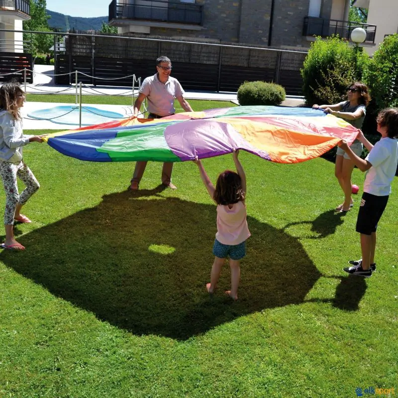 Estes paraquedas em cores brilhantes do arco iris tornam as atividades em grupos mais atrativas. De maior dimensão que o paraquedas por pares tradicional, facilita as atividades com objetos maiores. Confecionados em poliéster resistente e 4 pegas, permite a 2 pessoas atividades de cooperação e coordenação lançando e recebendo objetos. Também podem ser utilizadas em atividades de expressão corporal.