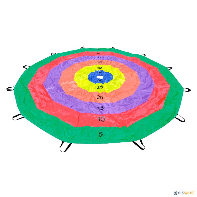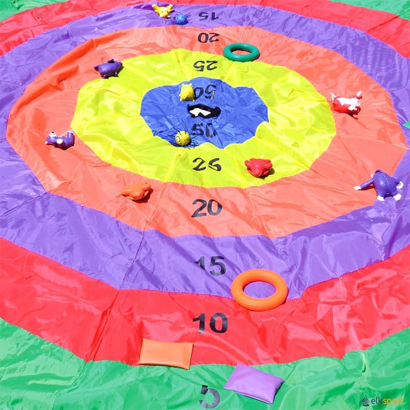 O paraquedas alvo arco-íris é um produto versátil — além das atividades clássicas dos paraquedas tradicionais, também pode ser utilizado como um grande alvo gigante de chão. Cada cor tem um valor, sendo mais elevado quanto mais próximo do centro.