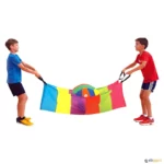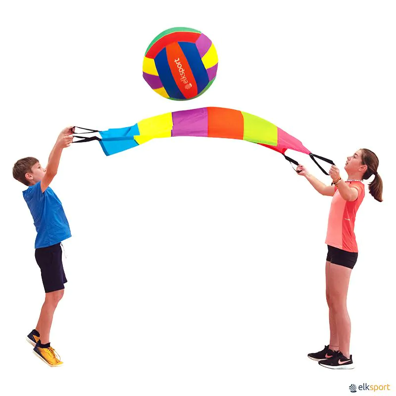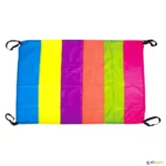 Estes paraquedas em cores brilhantes do arco iris tornam as atividades em grupos mais atrativas. De maior dimensão que o paraquedas por pares tradicional, facilita as atividades com objetos maiores. Confecionados em poliéster resistente e 4 pegas, permite a 2 pessoas atividades de cooperação e coordenação lançando e recebendo objetos. Também podem ser utilizadas em atividades de expressão corporal.