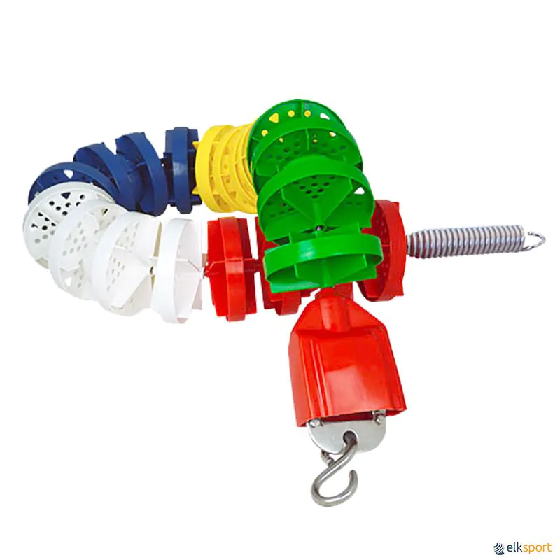 Composto por discos anti onda de 100 mm de diâmetro e inclui um tensor de cabo especial em aço inoxidável e mola de tensão para cordas flutuantes de acordo com norma EN13451-5.