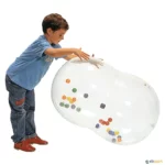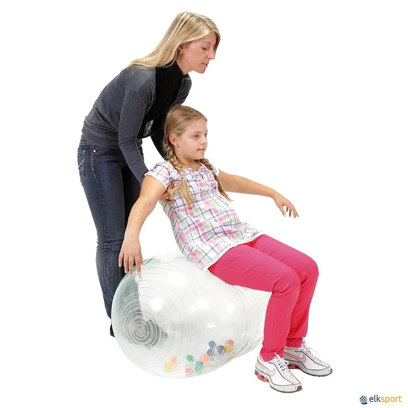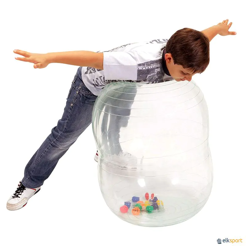 Physio Roll transparente com pequenas bolas coloridas no seu interior, que favorecem novos estímulos nas atividades físicas adaptadas.