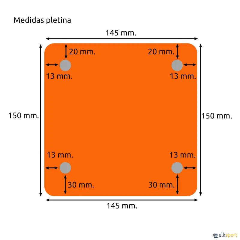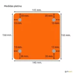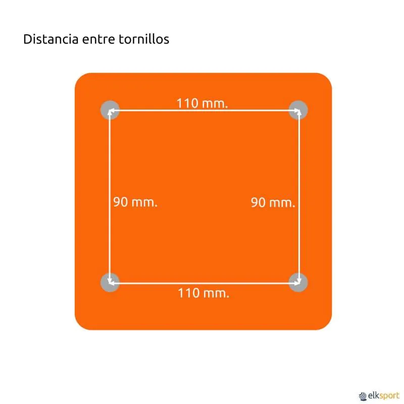 Dimensões da peça do aro, que deve se encaixar na placa de montagem terá 14,5 cm de largura no máximo 1 cm de espessura. Distância entre parafusos 11 cm na horizontal e 9 cm na vertical. Os aros basculantes não se encaixam nesta placa devido à espessura gerada pelas molas