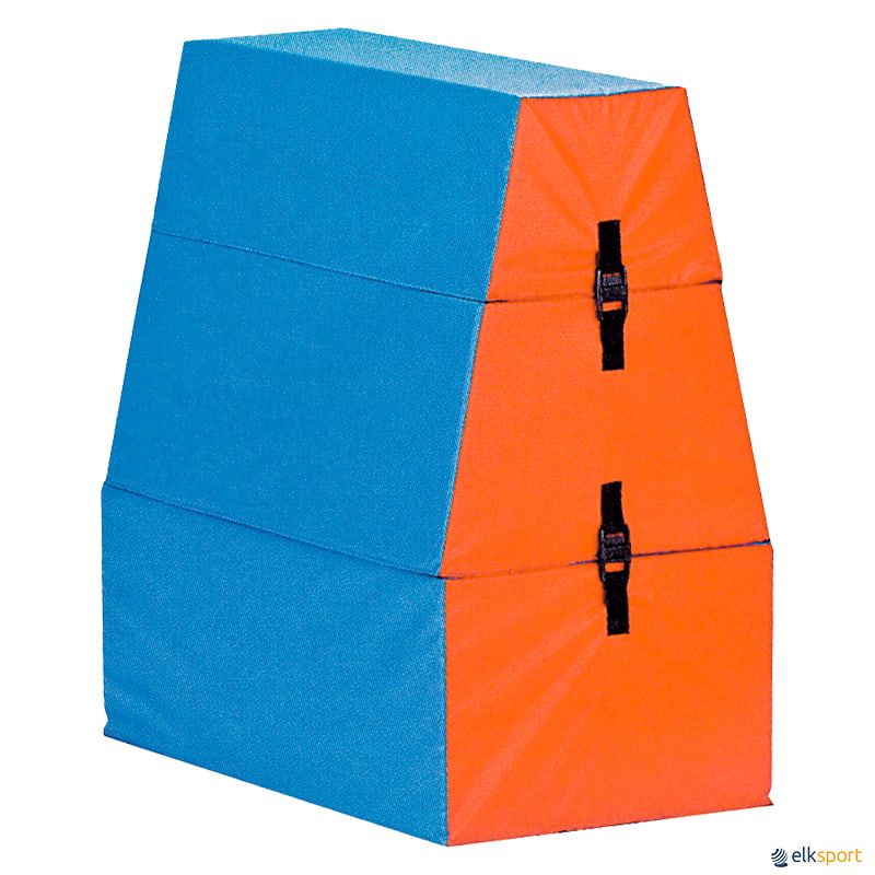 Plinto piramidal em espuma forrada que auxilia o professor no ensino das evoluções ginásticas. Fabricado com 3 blocos em espuma de densidade 25 sobrepostos, e unidos por bandas de velcro. Plinto com base antiderrapante.