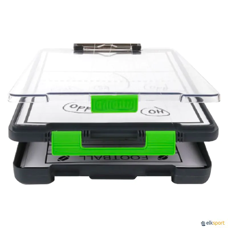Composta por 2 compartimentos independentes e clipe externo metálico. Compartimento inferior de grande capacidade e compartimento superior com tampa transparente que contem e protege esquemas dos campos, listas ou planos de treino, o que permite que seja muito acessível e fácil de ver. Alem disso, a tampa pode ser usada para escrever com apagadores de apagamento a seco.