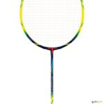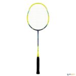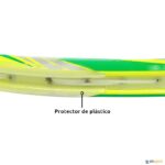 Raquete de badminton em alumínio com cabo em carbono, construída numa só peça. Desenhada com dupla proteção para as cordas: armação com canal que permite que o encordoamento fique protegido do contacto com o solo, e peça de plástico na parte superior para proteger também essa zona da raquete.