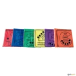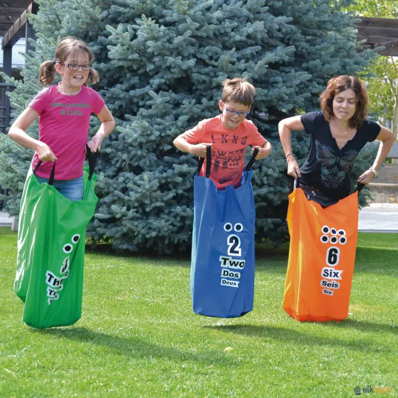 Sacos polivalentes desenvolvidos para o jogo tradicional de corrida de sacos ou para outras atividades. A ideia foi criar sacos, que sirvam tanto para desenvolver as habilidades motoras ou cognitivas, como para armazenar e transportar objetos, facilitando assim a organização de materiais nas aulas. O saco é fabricado com uma costura resistente, para garantir a sua durabilidade, com base plana e duas alças, para se transportar melhor os materiais ou o jogador que se encontre dentro. Estão numerados do 1 ao 6, com pontos, algarismos e letras em inglês, espanhol e francês.