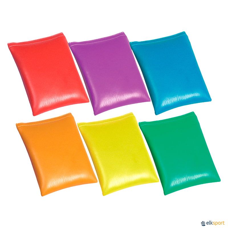 O conjunto é composto por: 6 saquitos em 6 cores (amarelo, azul, laranja, vermelho, verde e violeta).