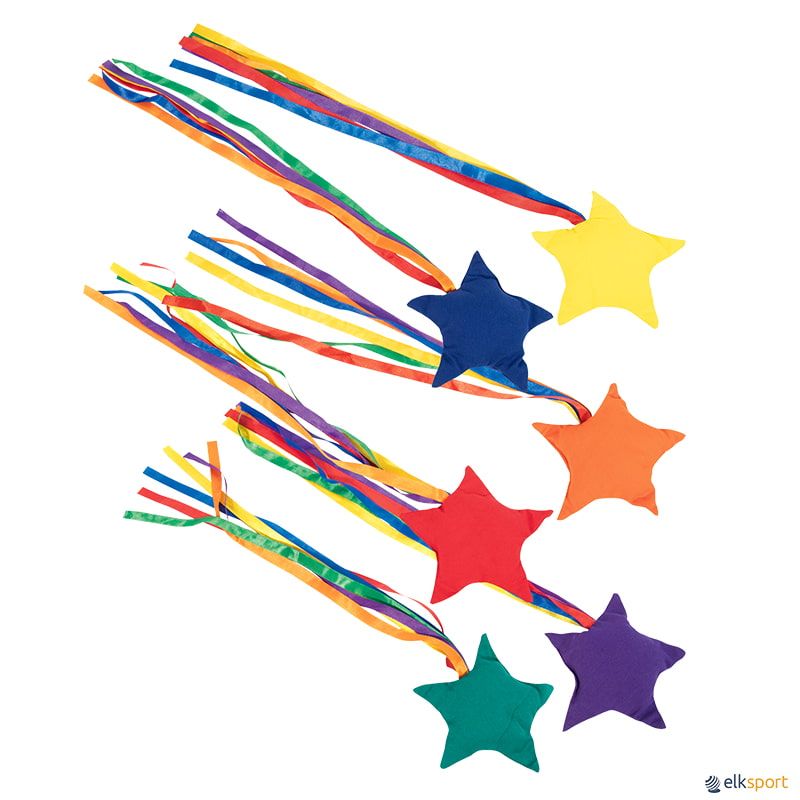 Conjunto de 6 saquinhos em forma de estrela, aos quais foi adicionada uma colorida cauda de fitas, para tornar o lançamento mais visível e facilitar a receção. Fabricados em tecido de algodão.