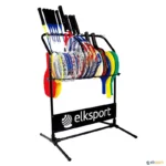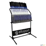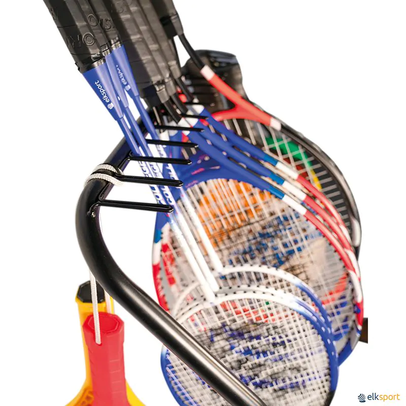Descobre como é fácil armazenar e transportar raquetes. Para organizar todas as raquetes num único suporte de forma excepcional, adicionando uma solução simples e eficaz ao armazenamento na sala de materiais. Graças ao seu peso reduzido, pode ser facilmente transportado manualmente para o ginásio ou campo onde a aula é ministrada. O suporte possui 14 compartimentos de armazenamento para raquetes com pega larga, como ténis, padel, pickleball, etc., mas pode ser duplicado até 28 para raquetes, como as de badminton.Na parte superior, tem 15 ganchos para pendurar raquetes com cordão na pega ou materiais semelhantes. A prateleira onde pousam as raquetes é ajustável em altura através de um simples movimento de dois acessórios em cada extremidade. Fabricado em aço muito leve pintado a pó, resistente ao desgaste institucional e à humidade. Muito fácil de montar.