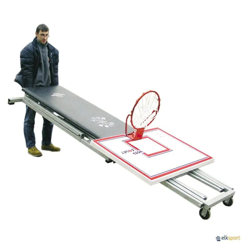Tabela de basquete para aplicação na parede, rebatível horizontalmente. Tabuleiro de fibra de 20 mm e avanço de 2,25 m com adaptador para a prática de mini basquetebol.