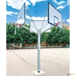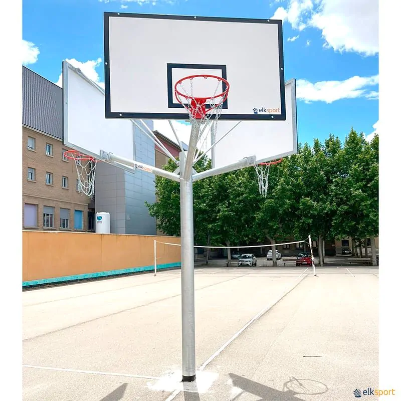 Poste com 3 tabuleiros em uma única estrutura, perfeita para otimizar o espaço e permitir que vários jogadores pratiquem ou joguem partidas de 3 contra 3 simultaneamente. Fabricada com um poste central em tubo redondo de 3,5 mm de espessura, tabelas de fibra de vidro e um avanço de 1,2 m. Fixação ao solo com âncoras de haste inclusas. Inclui redes de polipropileno. Entregue montado; prever custo de transporte por MATERIAL VOLUMOSO.