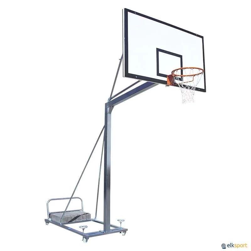 Tirantes telescópicas para uma melhor regulação do tabuleiro, muito sólidos e resistentes estrutura por trás do tabuleiro para um maior reforço do tabuleiro e do aro. Todas as partes metálicas são submetidas a um tratamento galvanizado anticorrosivo, para evitar a oxidação, dando um aspeto final de acabamento metálico. São necessários 8 contrapesos por cada tabela de Basquete e 6 para cada tabela de Minibasquete. A tabela leva 2 rodas fixas e 2 giratórias e volante de fixação ao solo. Vendido á unidade, com aro e rede incluídos.