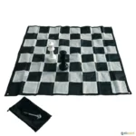 Tabuleiro de xadrez gigante em nylon, lavável na máquina. Uma forma diferente e muito divertida de jogar xadrez, com olhais nas esquinas, entregue com espias de aço para espetar no solo. Não inclui peças de xadrez nem de damas.