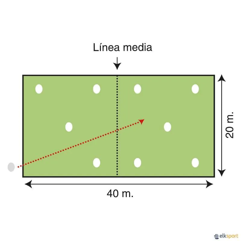 A partida é jogada em 4 sets de 16 jogos. Dimensões recomendadas do campo: 40 x 20 m.