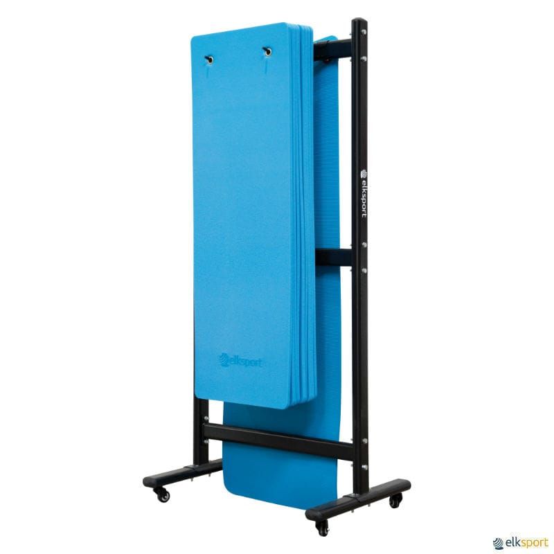 Suporte para tapetes compacto regulável em altura. Com 4 ganchos ajustáveis em largura e 4 rodas (2 delas com travão) para facilitar o transporte e a arrumação dos tapetes.