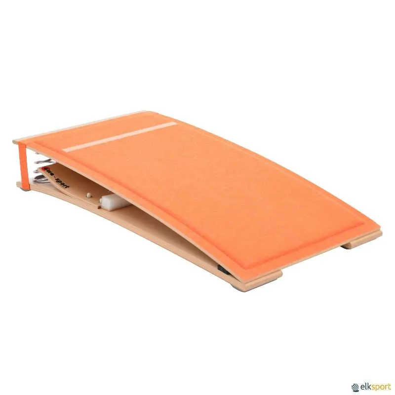Trampolim Reuther com base anti deslizante com pés em borracha. Piso em alcatifa com marca para a zona de chamada. Debaixo da alcatifa existe uma camada de espuma de alta densidade.