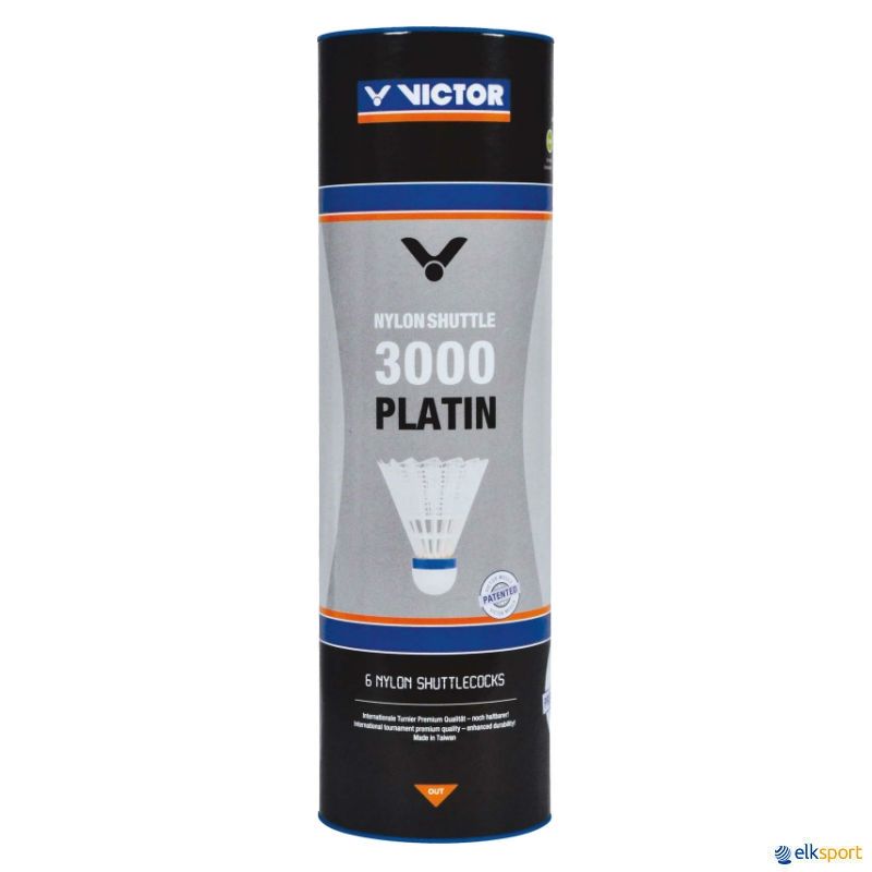 Tubo com 6 volantes de badminton Victor 3000. Volantes de alta qualidade muito parecidos com os volantes de penas naturais. Com saia em Nylon branco e cabeça em cortiça natural de alta qualidade.