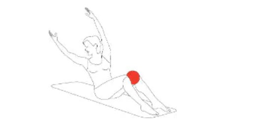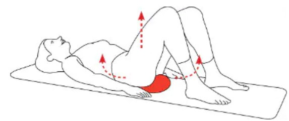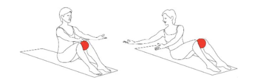 Inspire na posição inicial. Durante a expiração, gire o tronco inclinando-o para o chão, aperte a bola entre as pernas e mantenha os glúteos colados ao colchão.