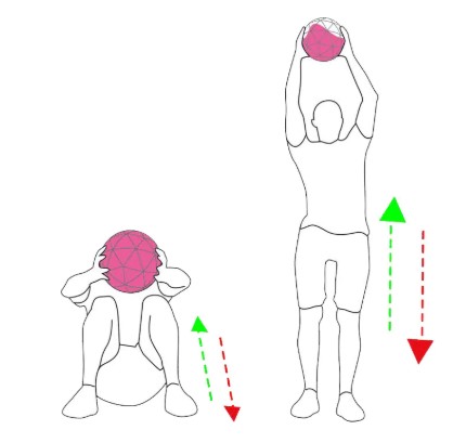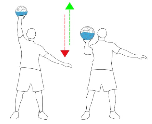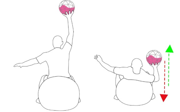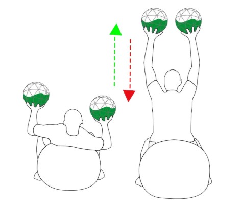 Realize um alongamento para cima, começando com a bola na altura da orelha, até o ponto mais alto possível. Mantenha uma trajetória retilínea. Volte à posição inicial. Repita também com o braço oposto.