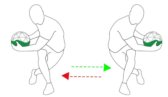 Realizar um salto lateral, mantendo, na posição de queda, o apoio na perna interna e levando a bola pelo lado externo, mantendo-a até a pélvis.