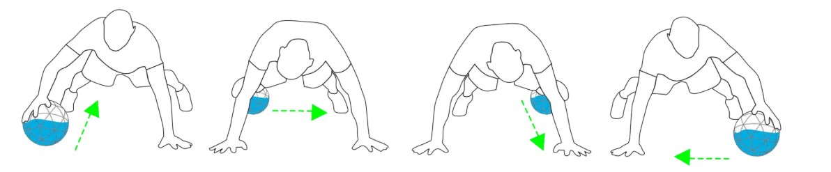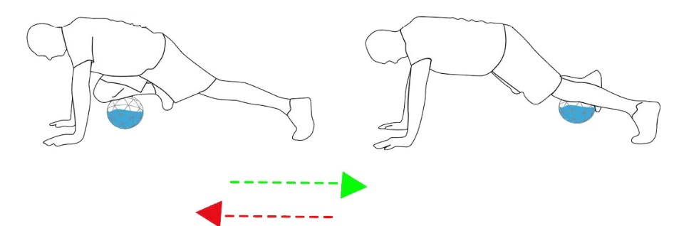 A partir da posição de prancha, realize passagens transversais apoiando-se no chão e na Skin Ball, mantendo a postura correta. É necessário coordenar as passagens para evitar o risco de perder o equilíbrio.