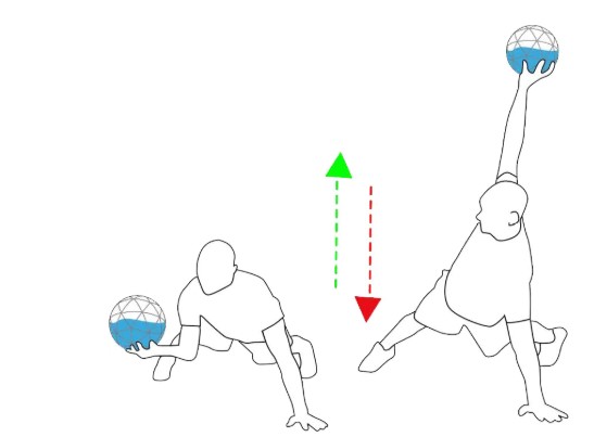 Faça uma rotação sobre as costas e uma extensão completa para cima, arremessando com energia a Skin Ball contra o chão. Recupere a Skin Ball e repita o exercício.