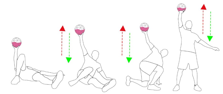 Usando uma bola de fitness, passe da posição supina para a sentada, movendo apenas a parte inferior das costas, fazendo um impulso simultâneo para cima com as Skin balls. Volte à posição inicial.