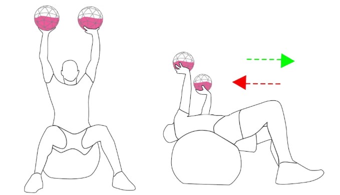 Usando uma bola de fitness, passe da posição supina para a sentada, movendo apenas a parte inferior das costas. Empurre a bola para cima. Volte à posição inicial e repita o exercício com o outro braço.